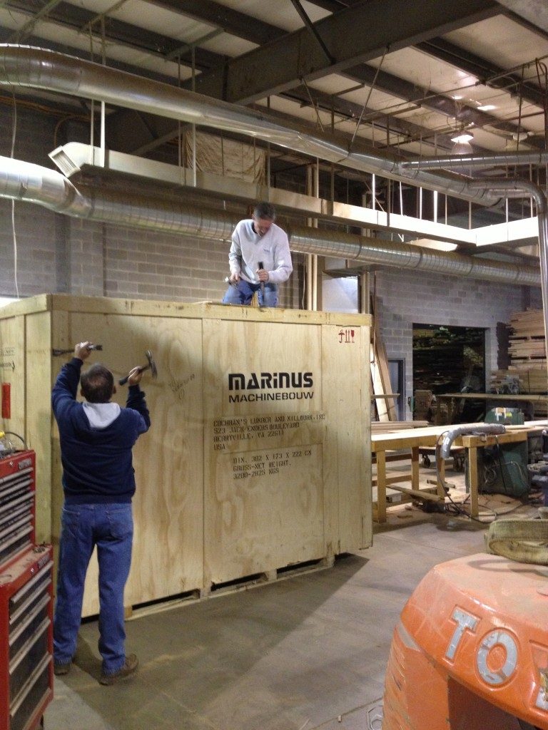 All the way from Amsterdam…  Our new end-matcher/defecting saw/ fixed length chop saw has finally arrived. I will post more about this later as we get it set up!