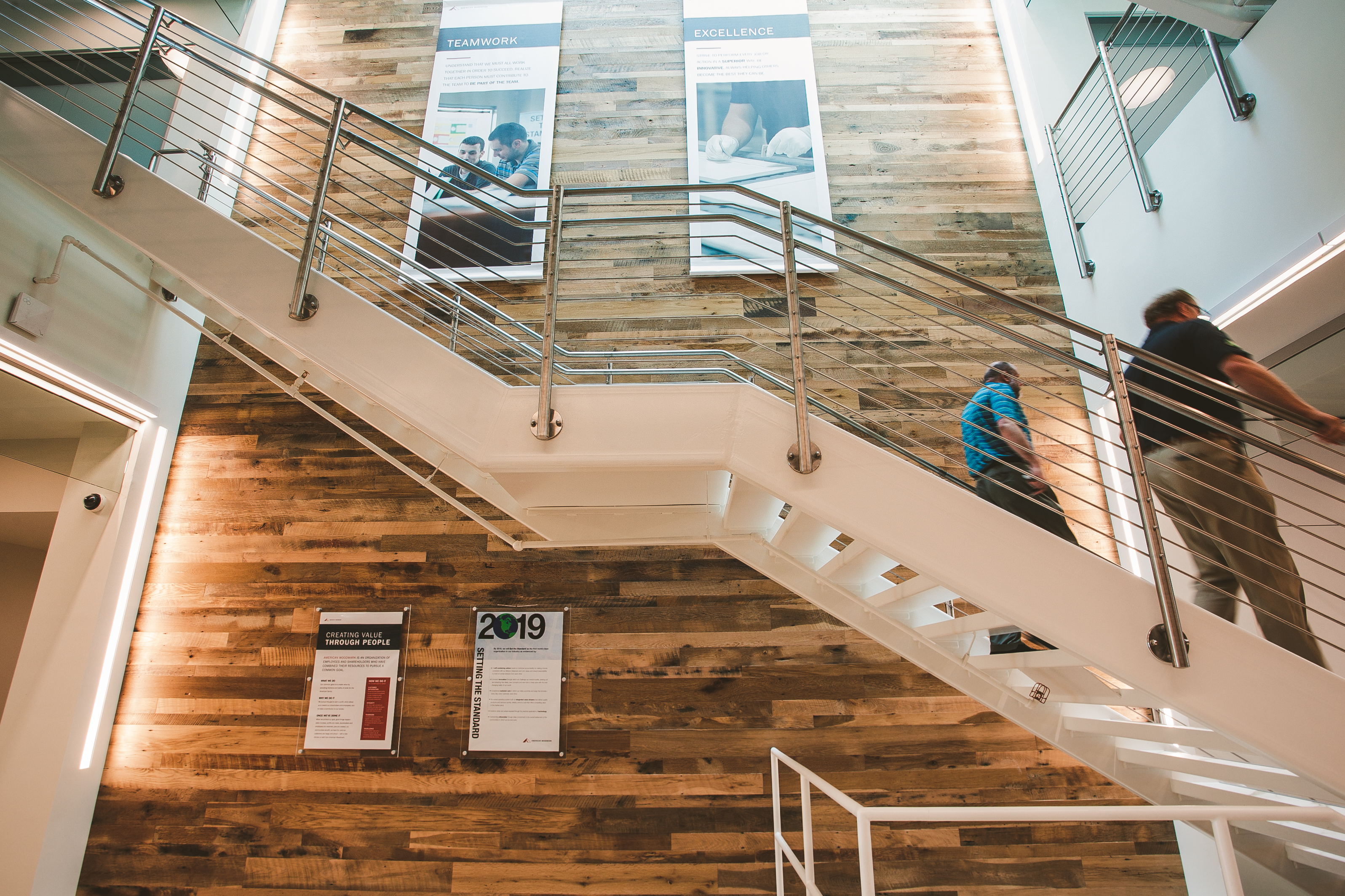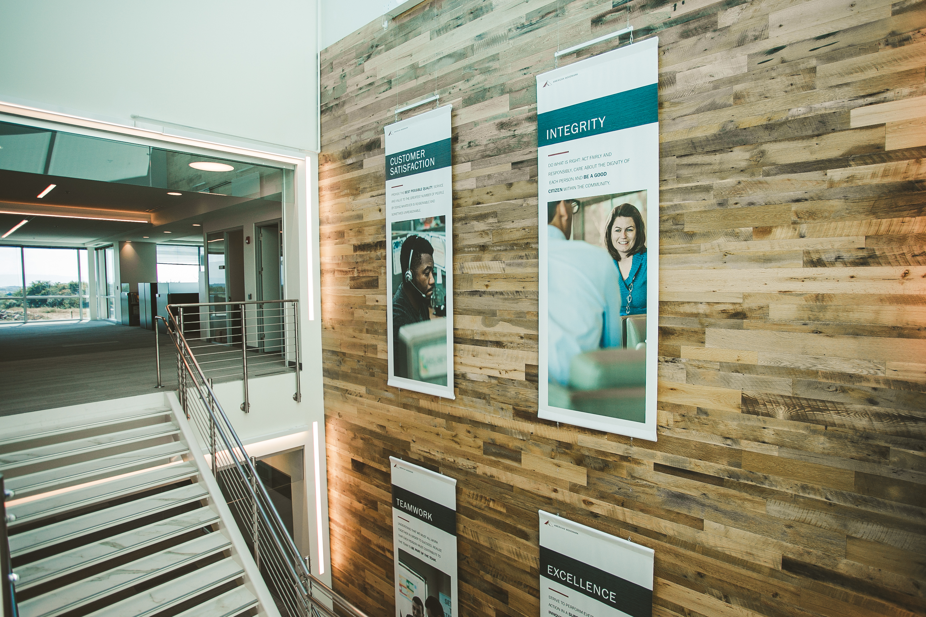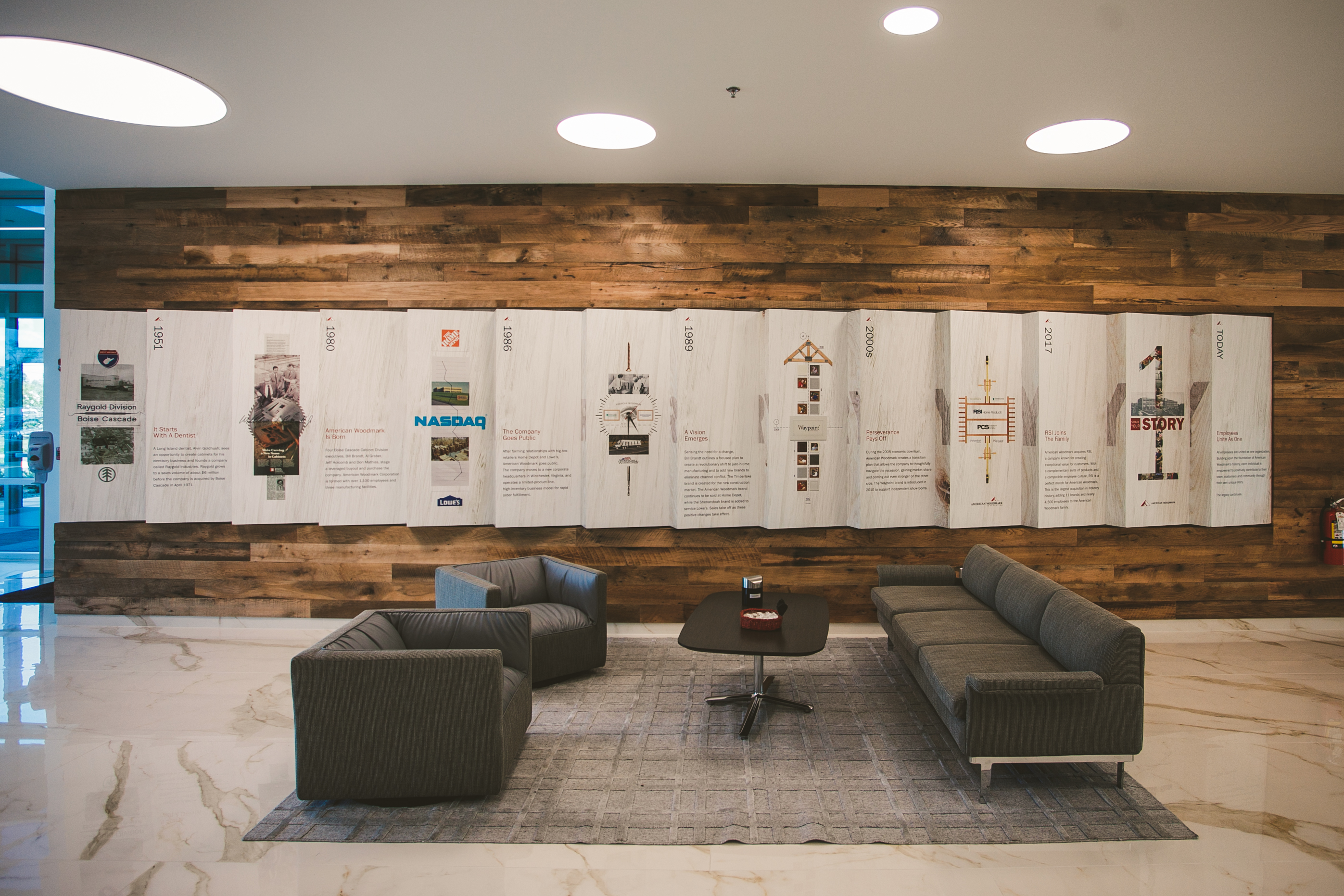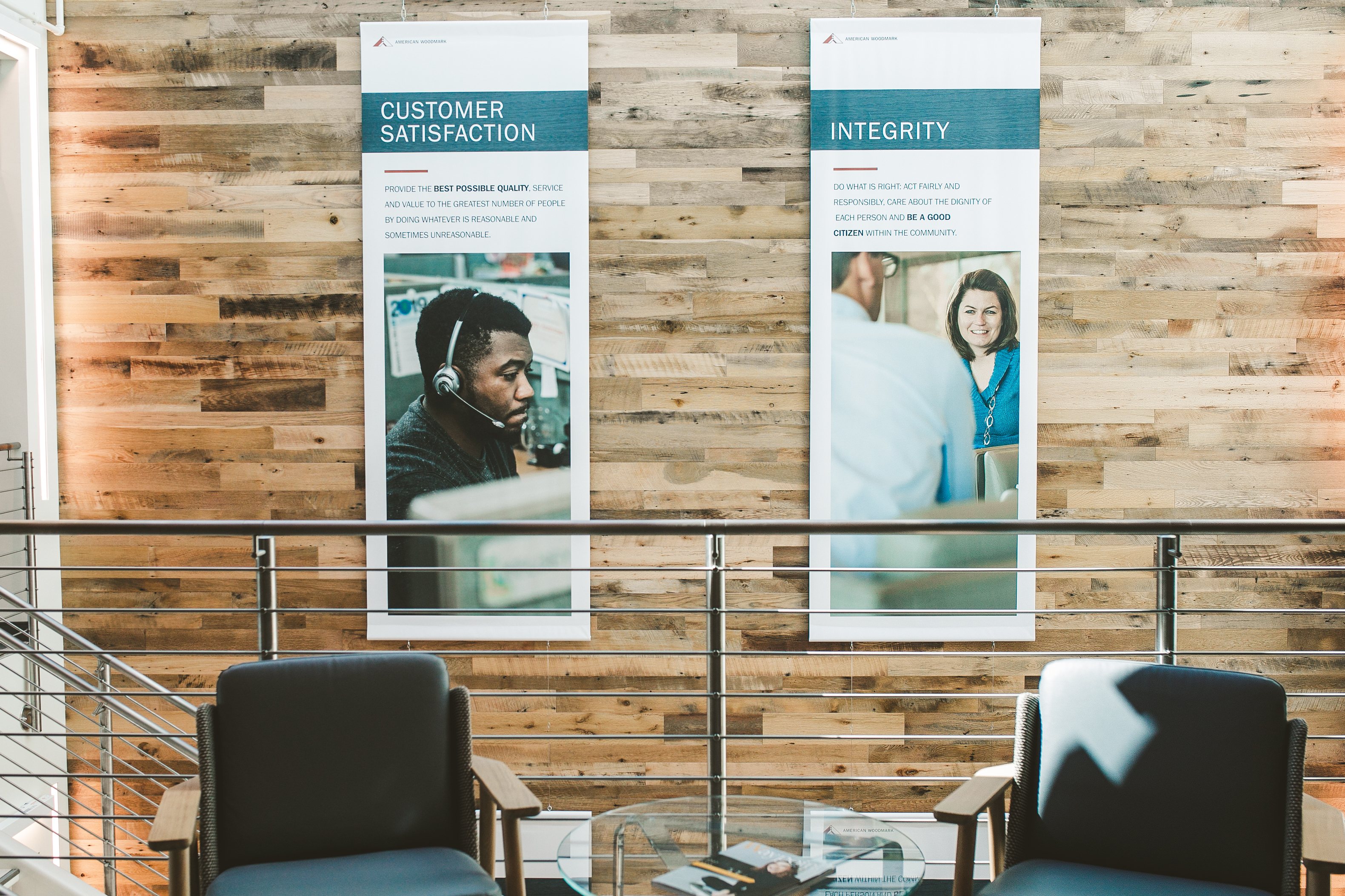Cochran’s Antique Oak Distressed makes a bold statement at the newly renovated American Woodmark Corporate Office, a project completed by Kinsley Construction Co. Used on several walls throughout the lobby and reception area, the reclaimed wood gives depth and contrast to the open concept space. This unique use of flooring on walls lends modernity to a product that is historically installed in rustic and traditional spaces.