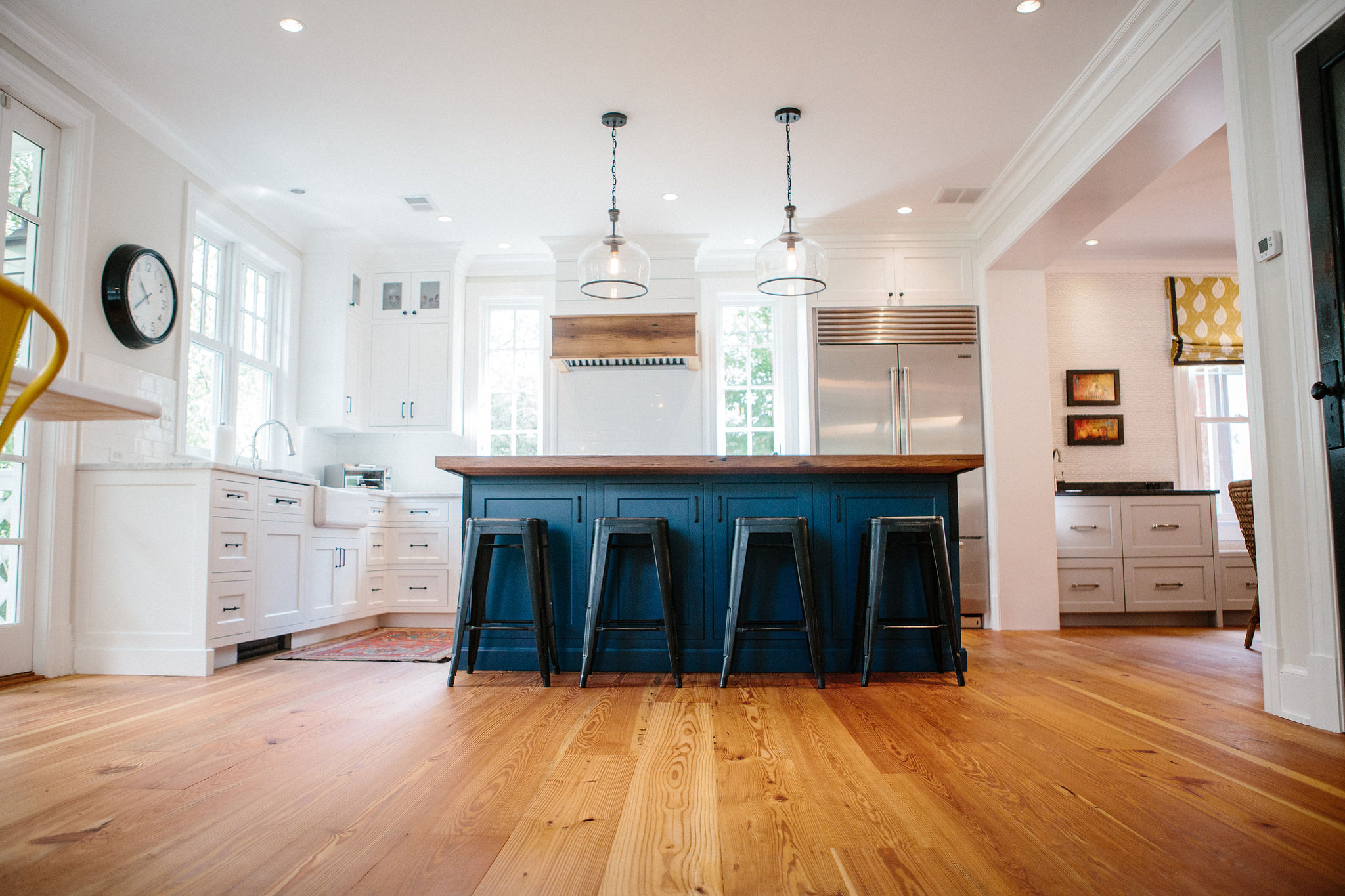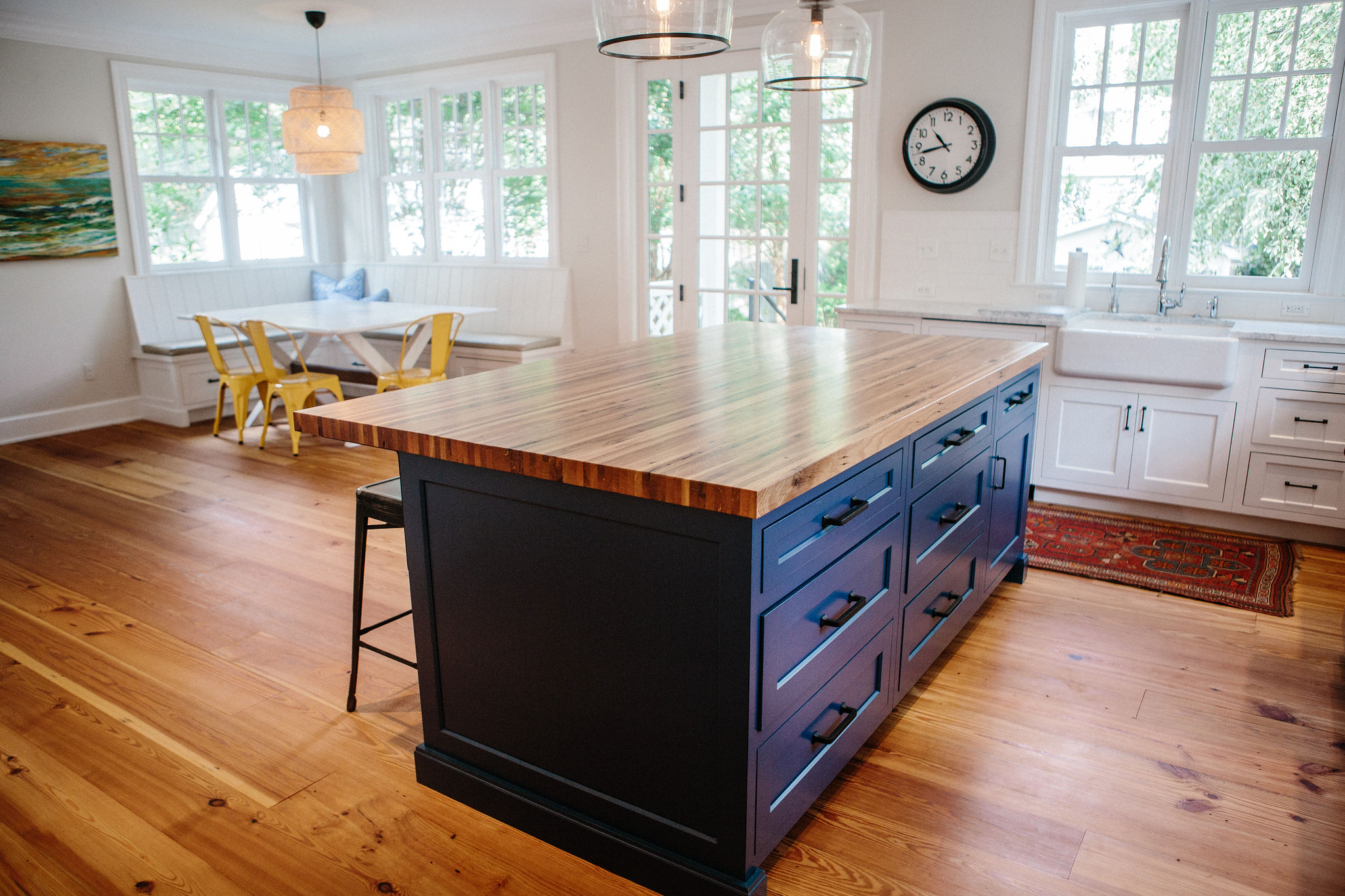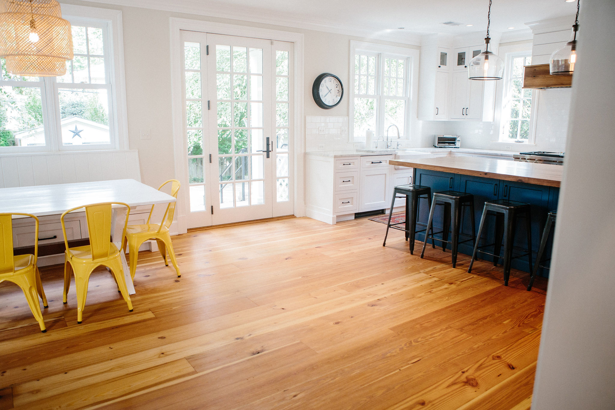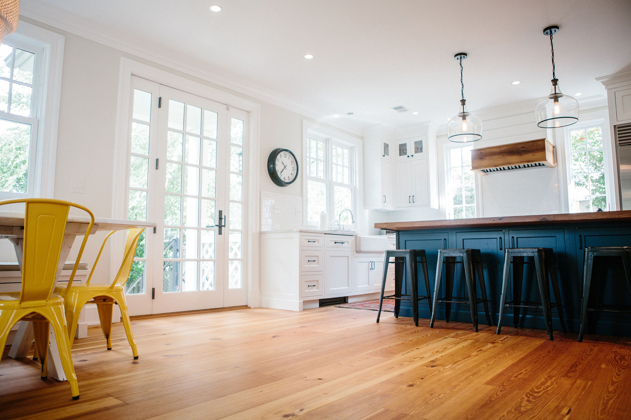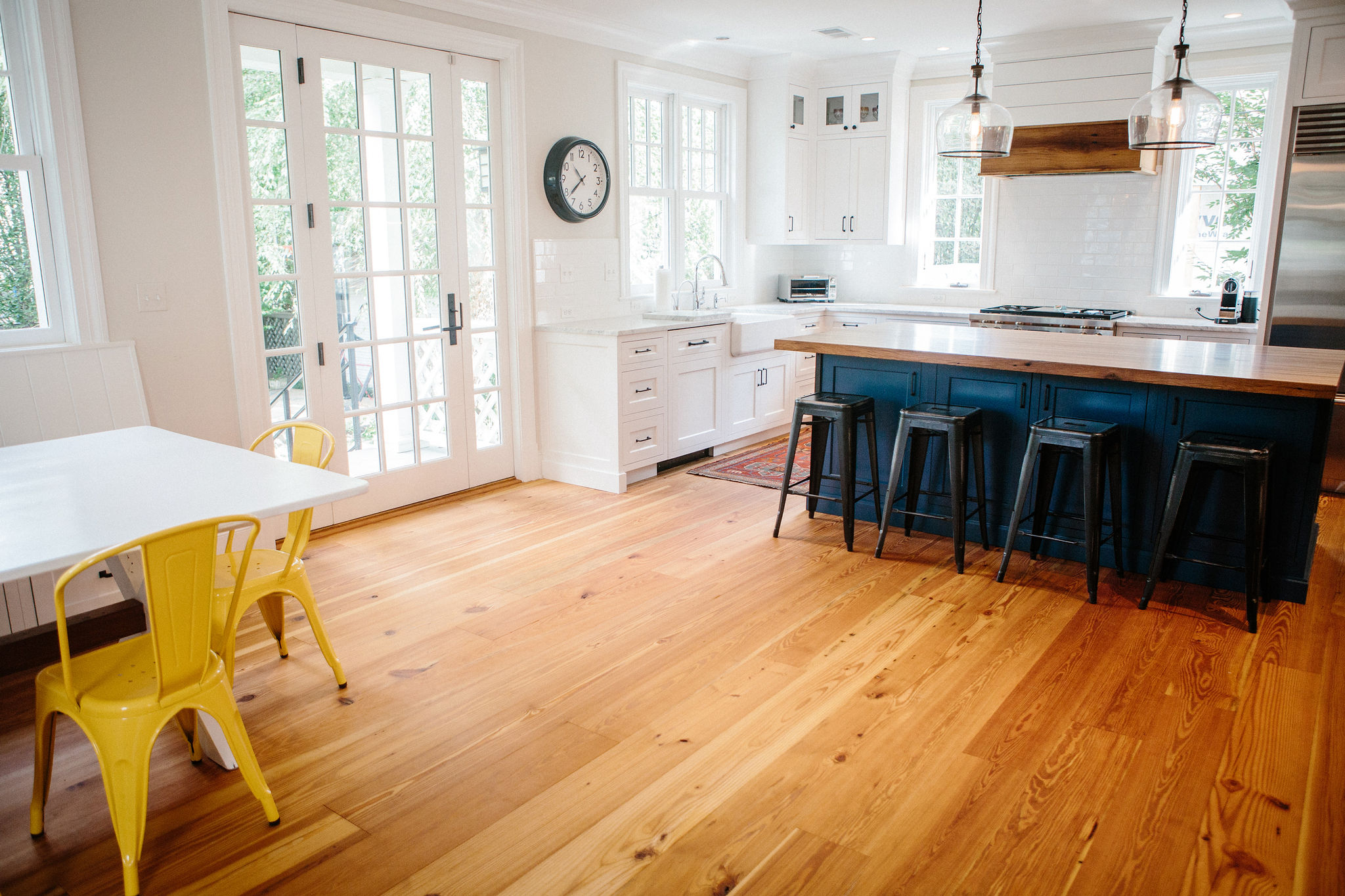 When our friends at Finn Construction Company, Inc. took on the tedious task of renovating a 1930s brick bungalow in Alexandria, VA, they turned to Cochran’s Lumber for period-appropriate flooring. The results are a stunning open concept space that embraces both the home’s history with our wide-plank Heart Pine flooring and its functionality with our gorgeous Antique Oak butcher block kitchen island and countertop.
